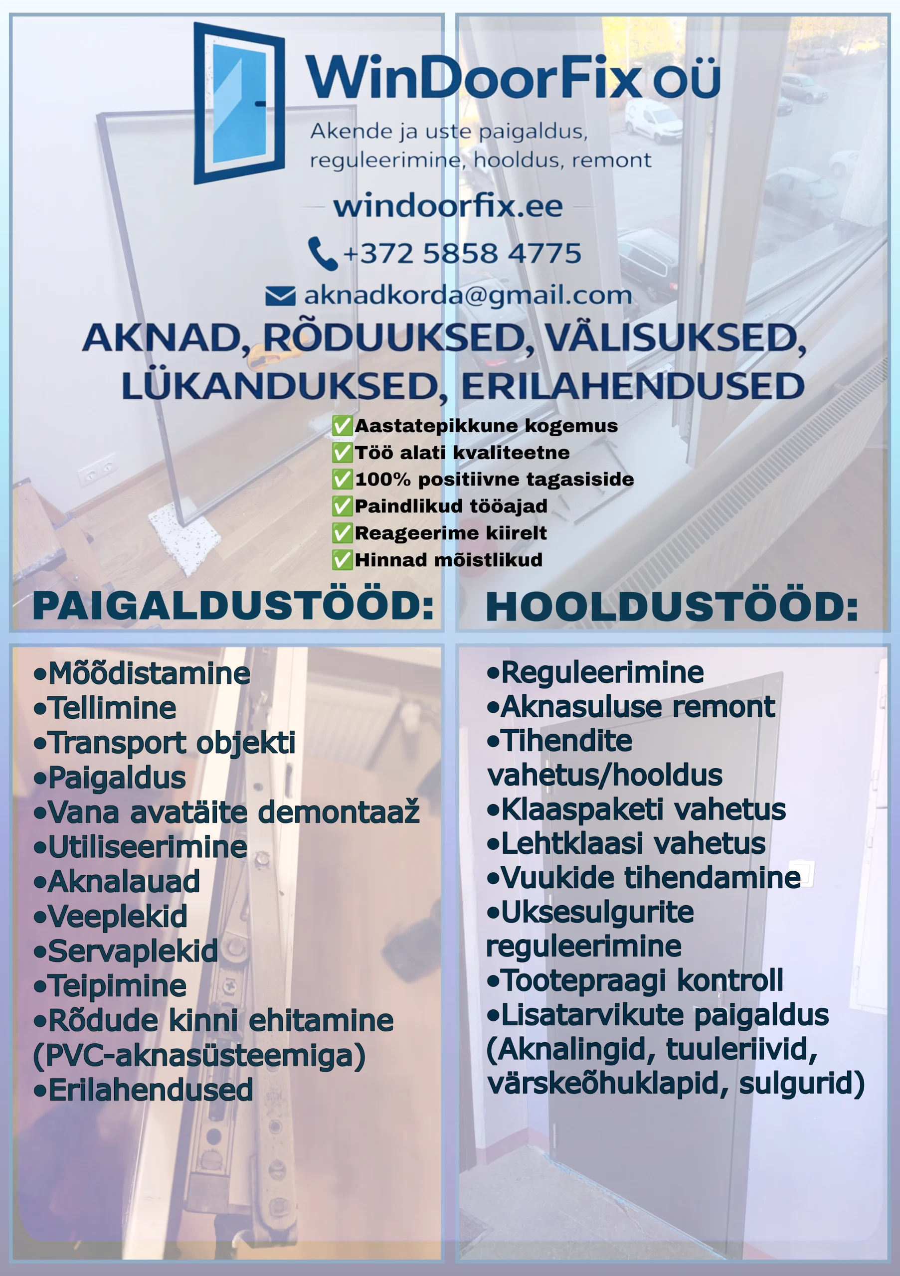 Oleme spetsialiseerunud ainult akna- ja uksetöödele - paigaldus, reguleerimine, hooldus, remont